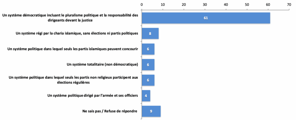 Six Syriens sur dix (60 %) affirment que, malgré ses défauts, le régime démocratique reste supérieur à tout autre système politique. À cette opinion s’ajoute le constat qu’une majorité (61 %) considère aujourd’hui la démocratie comme la meilleure option pour la Syrie, tandis que le soutien aux autres régimes ne dépasse jamais 10 %.
