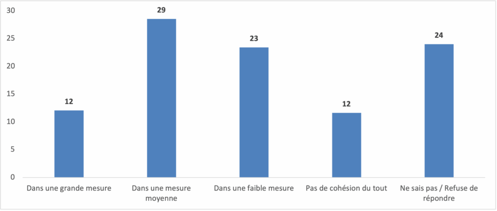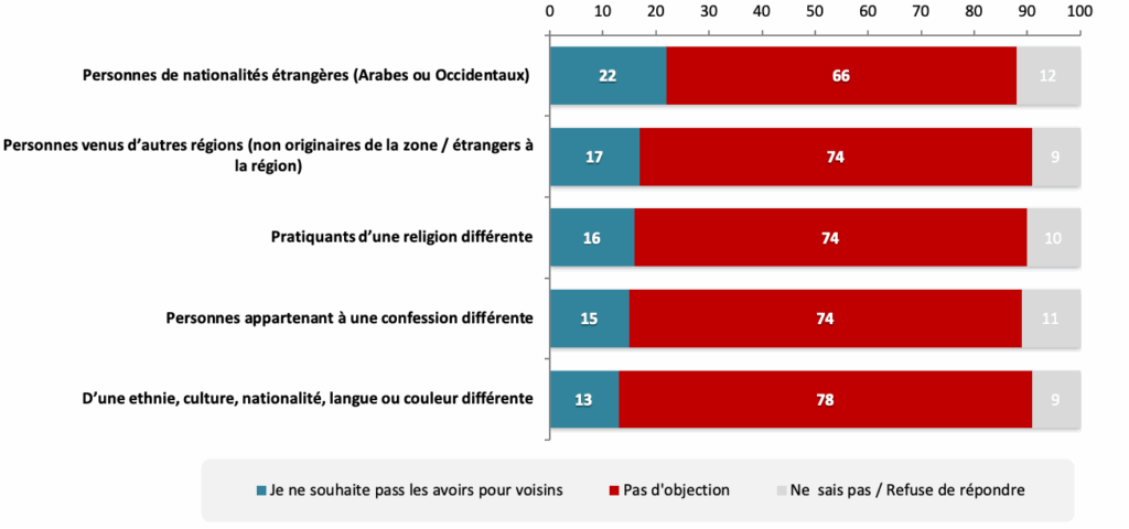 Pour autant, les réponses nuancent ce constat. Deux Syriens sur trois (66 %) déclarent ne faire aucune distinction dans leurs relations sociales en fonction de la confession ou de la religion. Seul un quart avoue privilégier les contacts avec des personnes de la même appartenance. De plus, une majorité (entre 66 et 78 % selon les catégories) affirme n’avoir aucune objection à vivre aux côtés de voisins d’une autre religion, confession ou ethnie, ce qui traduit une volonté affirmée de dépasser les clivages.