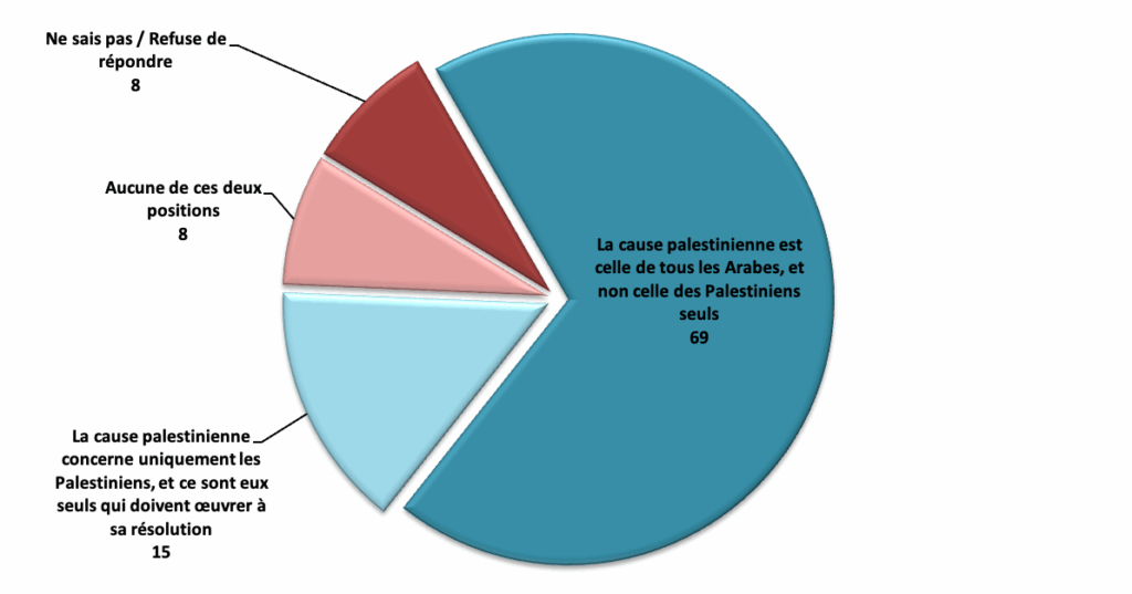 La cause palestinienne conserve une place centrale dans l’opinion publique syrienne. Près de sept Syriens sur dix (69 %) affirment qu’il s’agit de « la question de tous les Arabes et pas seulement des Palestiniens », tandis que 15 % estiment qu’elle concerne exclusivement le peuple palestinien.