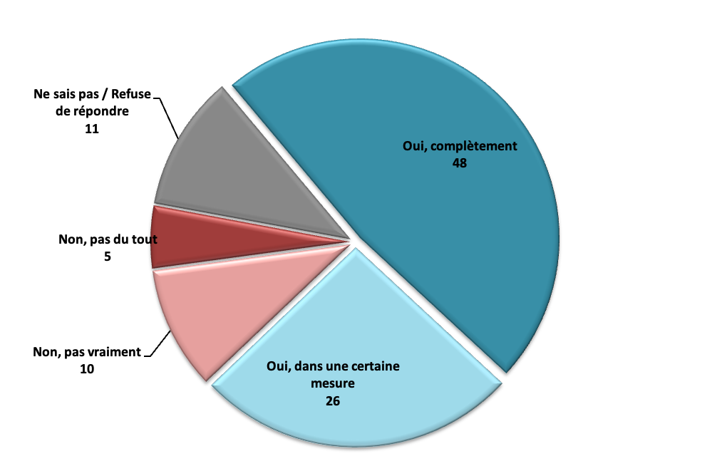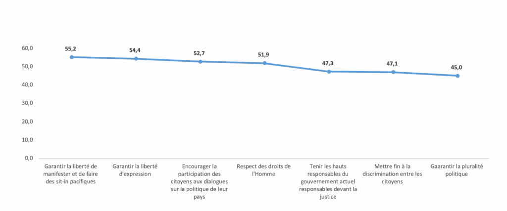 Cette adhésion théorique s’accompagne d’une tolérance politique relative : 53 % des répondants déclarent qu’ils accepteraient l’accession au pouvoir d’un parti politique avec lequel ils sont en désaccord, si celui-ci obtenait la majorité lors d’élections libres et équitables.