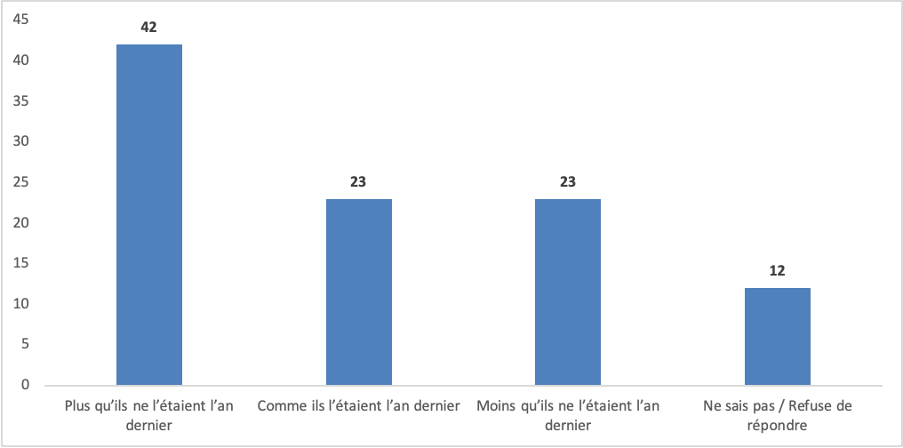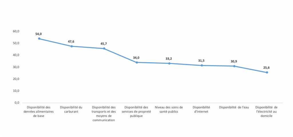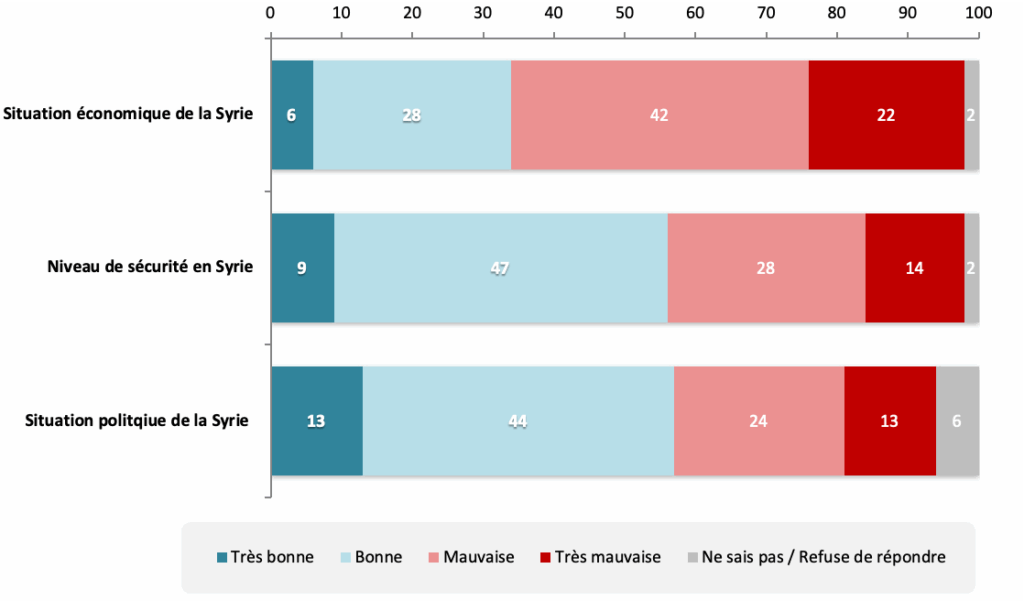 L’évaluation des conditions actuelles confirme cette ambivalence : 57 % jugent la situation politique bonne ou très bonne et 56 % estiment que la sécurité s’est améliorée, tandis qu’une majorité qualifie la situation économique de mauvaise, voire de très mauvaise.