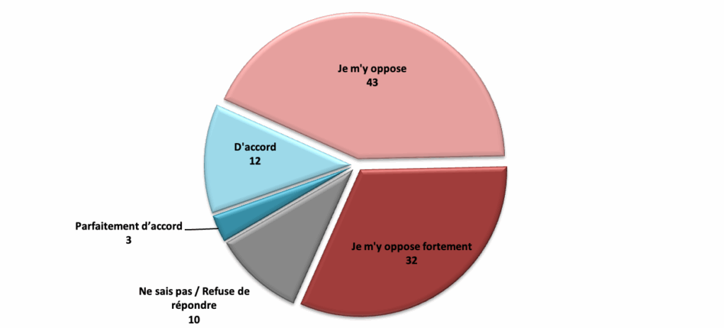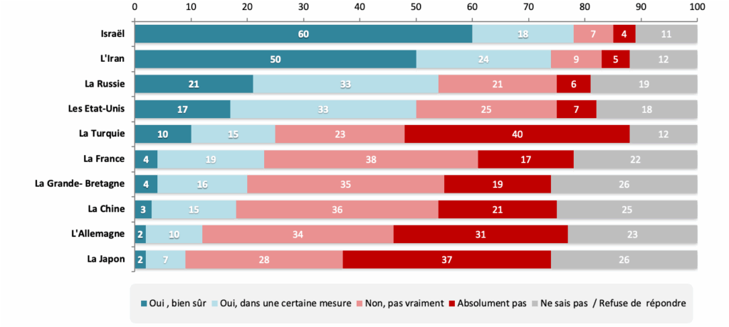 Dans cette logique, une très large majorité (74 %) rejette l’idée de reconnaître Israël. Seuls 17 % se disent favorables à une telle reconnaissance. Parmi les opposants, les justifications sont multiples : Israël est perçu comme un État colonial et occupant en Palestine, un régime expansionniste cherchant à dominer la région et ses richesses, un acteur raciste envers les Arabes, responsable de l’occupation du Golan syrien, de la dispersion des Palestiniens, de leur persécution continue et du refus de leur droit à l’autodétermination.