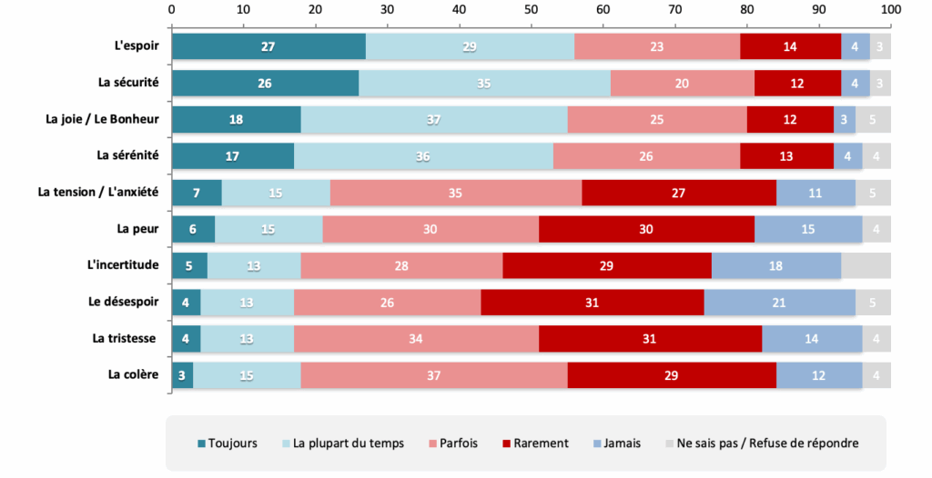 La chute du régime de Bachar al-Assad a suscité un large éventail d’émotions positives : entre 80 et 94 % des répondants disent avoir ressenti de l’espoir, de la joie, du bonheur ou du soulagement. Toutefois, une partie significative de la population (jusqu’à 80 %) confesse aussi des sentiments persistants d’inquiétude ou d’incertitude depuis ce bouleversement.
