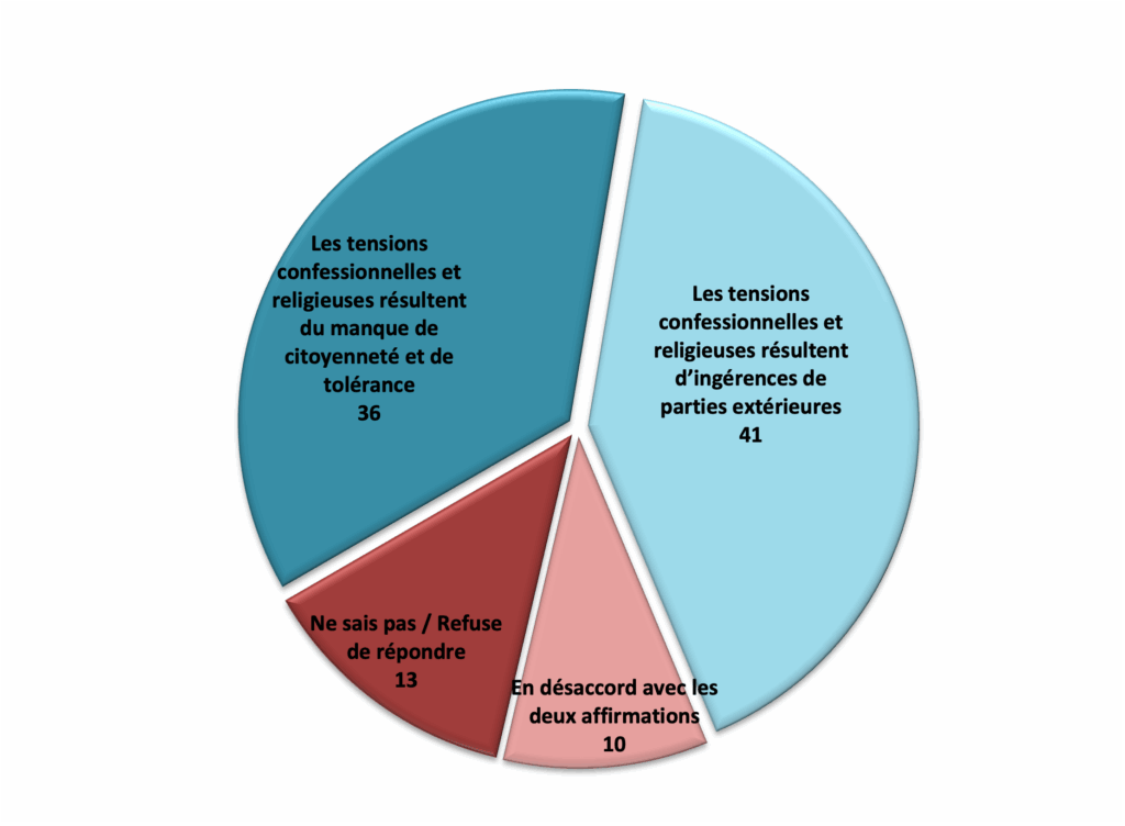 Concernant les causes des tensions sectaires et ethniques dans la région, les avis divergent : 41 % les attribuent avant tout à des ingérences étrangères, tandis que 36 % y voient le reflet d’un déficit de citoyenneté et de tolérance. D’autres évoquent le rôle des réseaux sociaux (18 %) ou la politique des régimes en place (7 %).
